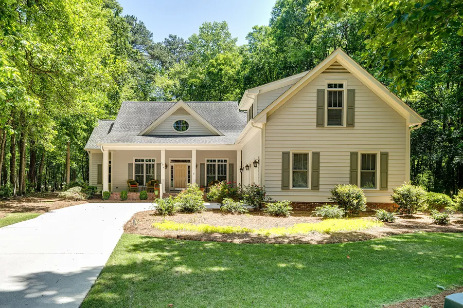 Located within the beautiful gated golf course community of River Landing, this immaculately crafted southern living home is neatly situated at the end of a quiet cul-de-sac within steps of the shaded walking path that runs throughout the community. The home was constructed with master craftsmanship and custom trim work, featuring chair rail picture frame wainscoting, transom windows, and hardwood floors throughout the downstairs. Designed with flexible use of space, the home features three bedrooms downstairs (one or two of which could be used as a home office) and a full second story with two bedrooms, a large bonus room, and an additional common sitting area complete with built in cabinets and a wet bar. The primary bedroom is located on the first floor with plenty of room for a seating area, a large walk-in closet with custom wood shelving, several large windows providing an abundanc...