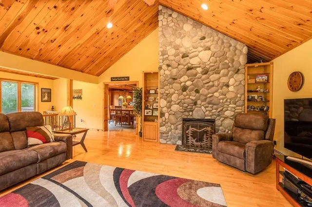 Impress your Guests! Embrace the beauty of this truly spectacular home set privately on your gorgeous property. The unique construction of this log home is unmatched with vaulted beamed ceilings throughout, and an abundance of natural sunlight in every room with custom windows. Surrounded by mature trees, you can enjoy the wildlife from every room in your home. This 3 Bedroom 3.5 Bath home features an oversized Family Room with a Floor to Ceiling Stone Fireplace, Large Updated Country kitchen featuring a huge center island with stools and access to two tiered deck, Dining room with a fieldstone fireplace, Office, Sitting Room & half bathroom. To complete this level you enter a magnificent master bedroom with walk in closets, upscale master bathroom with jacuzzi and an entry to your wrap around deck with multiple tiers. Proceed upstairs to 2 large bedrooms and a Full Bathroom which can be...