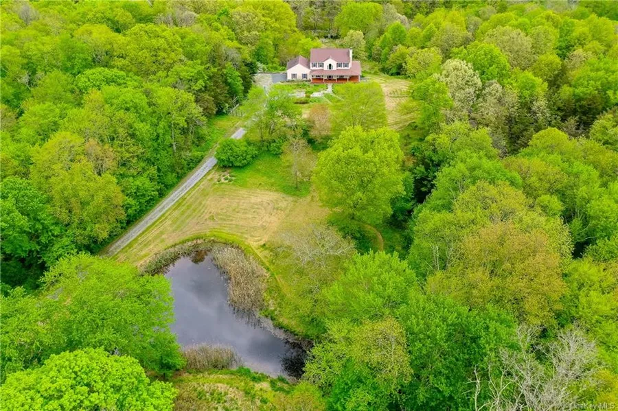 The discreet mailbox marks your arrival. Lush forestry takes pause at driveway edge, beckoning unfettered progression to exhale. Spotted with wooden rail fencing along the way as trails loop throughout the property, the pond is the first official greet. Sweet sounds of nature quickly envelop with a full sensory experience this property so graciously bestows. The swing hangs from a tree at wood line while stacked wood seasons for next frost. The farmhouse style wraparound porch with stone fire-pit on adjoining patio await lounge in this bucolic setting. Windows frame nature as art throughout the home. The home and level front property are positioned on a crest to capture pond views in front with decline to Wappinger Creek beyond the residence. The sleigh riding slope beyond the home meets creek and wooden bridge with the third nature loop on property, camp trail. The property and home are beautiful as is or provide a canvas to create your own bucolic wonderland.