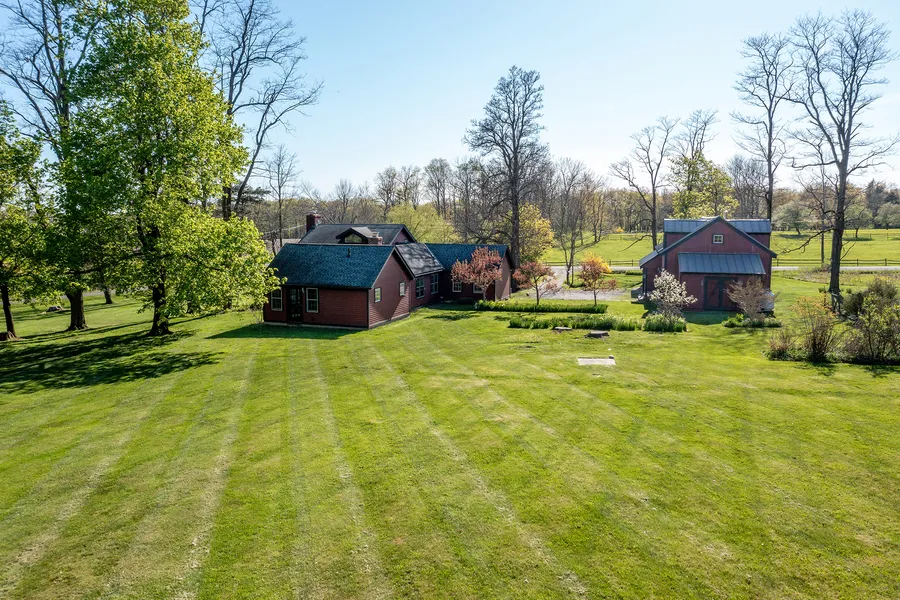 Magical! There is just something about this property that makes it very special. Set on a beautiful, quiet road, the house is surrounded by 15.63 stunning acres of rolling meadows, perennial gardens, flowering trees, a lightly wooded glade and beautiful forest. Step from the front stone terrace into the light-filled house in which every room is filled with character, including original beams, gorgeous floors, wood burning fireplaces and vaulted ceilings. There have been many updates to this home including a spacious first floor primary bedroom suite addition that blends seamlessly with the original structure. The main house has two additional bedrooms, a den and two offices. A separate, most enchanting 19th century barn was turned into a year round, one bedroom guesthouse with full kitchen, full bath, soaring ceiling and barn wood walls. This space could also be a wonderful studio. The p...