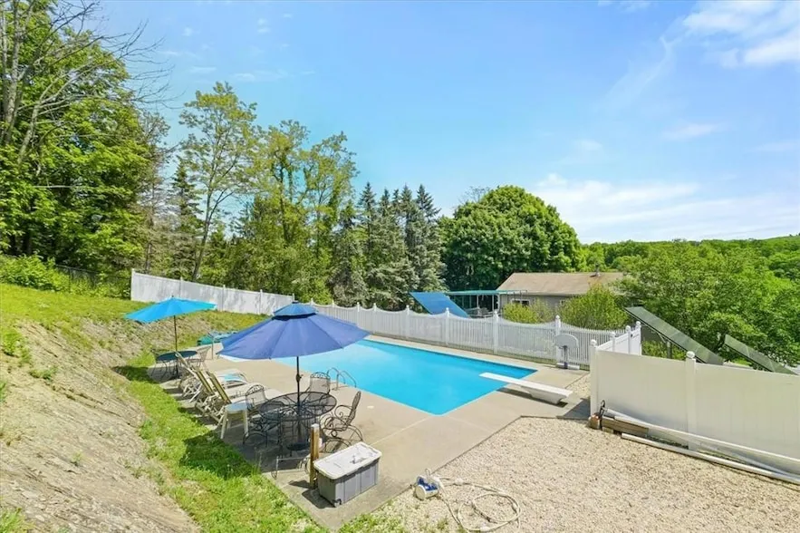 Peace and tranquility await you with this lovingly cared for raised ranch, featuring a heated, mineral-spring in-ground pool! From the moment you drive up the Rose of Sharon tree-lined driveway, to the second you see your own private backyard oasis...you will fall in love with this home and never want to leave. Set on 1.5 acres, this roomy home has spectacular mountain views from both the front porch and back yard. The rear composite deck is amply sized and shaded to provide comfort, privacy and an amazing entertainment space. Inside, you will find a generously-sized kitchen, dining room and living room, all with brand-new flooring! The primary bedroom has an en suite, with 2 other bedrooms and the main bath on this level. The lower level has a large family room, 3rd full bath and a den that opens out to the back yard. Plenty of parking plus a 2-car garage. Union Vale is a great place to...