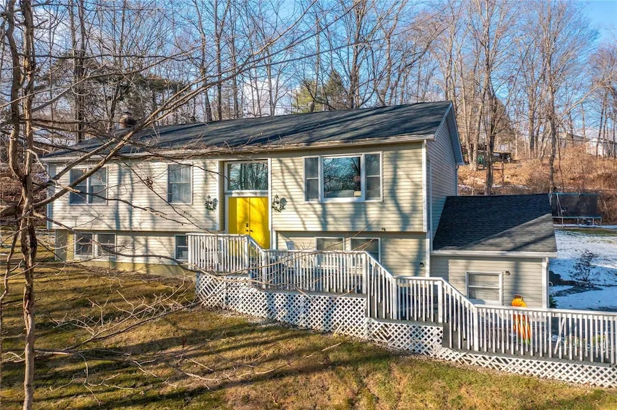 This charming, tucked-away Raised Ranch offers 3 bedrooms and 2 bathrooms, providing a cozy and modern living space. As you step through the front door and ascend the stairs, you're greeted by a bright and airy living room featuring a bay window and hardwood floors, which seamlessly flow into the dining area and open kitchen. The updated kitchen is equipped with stainless steel appliances, granite countertops, and a breakfast bar, with a door leading out to the back deck perfect for entertaining or relaxing. Down the hallway, you'll find two generously sized bedrooms, both with hardwood floors, and an updated hall bathroom. The primary suite also features hardwood floors and an updated en-suite bathroom, complete with a luxurious tiled walk-in shower. The lower level provides even more space for living or entertaining, with a large laundry and mechanical room, a convenient half bath, and a spacious tiled living area with a cozy wood-burning stove. Additionally, there is a two-car garage, offering plenty of storage and parking space.