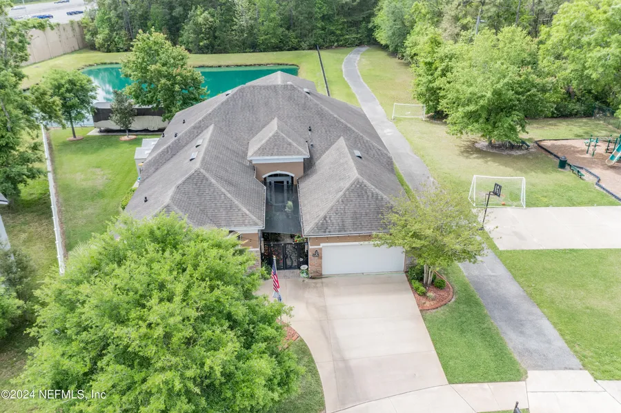 This 6BR/5BA home features a Full In-Law Suite w/it's own 1-car garage w/suite entry, full BR, walk-in closet, full bath, liv. room, mini kitchen, stackable W/D separate entrances to main home & front courtyard. Would make a good rental unit as well w/entry & privacy from main home! Main home has 5BR/4BA & features Gourmet Kitchen w/double wall ovens, 42'' cabinets, 1-y/o micro w/convec & bluetooth, DW, Fridge, island w/granite cntps, walk-in pantry & large breakfast room. Primary Suite is spacious & has walk-out to lanai Huge walk-in closet. Primary attached bath w/raised height double sink vanity, garden tub & tiled shower. 2nd floor Bonus Room is wide w/walk-in closet & full bath. All baths are full w/granite cntops & elongated toilets. Screened lanai overlooks Big fenced backyard that includes most of the lake behind the home to woodline. 2 parking pads 2 sheds. Irrigation well & freshly painted ext. Inside laundry, stop & drop @ 2-car garage. SEE SUPPLEMENT 4 MORE DETAIL Lennar NextGen home * FULL IN-LAW SUITE w/it's own 1-car garage that enters into suite. Full Bedroom w/big walk-in closet, full bath, living room, stackable W/D closet separate entrances to main home & front courtyard. The open kitchen has L-shaped granite countertops, sink, dishwasher & cabinets. Bedroom is carpeted & remainder is tiled. Separate HVAC & thermostat. Would make a good rental unit as well w/entry & privacy from main home! * Front Courtyard w/custom ornate metal gates at entry. * Main house has 5 Bedroom & 4 Full Baths. * 4 of 5 Bedrooms are carpeted w/walk-in closets. Bedroom #5 has wide plank hardwood floors, double French doors & bifold door closet. * All Bathrooms have tile floors, elongated toilets & whole house countertops have matching granite. * Main home has open floor plan & split Bedrooms. * Family Room is open & bright w/lots of windows & wide plank true hardwood flooring. * Gourmet Kitchen w/double wall ovens, 42'' cabinets, 1-y/o micro w/convection & bluetooth, glass electric cooktop, refrigerator, granite countertops. Island w/sink, dishwasher & seating & walk-in pantry. * Breakfast Room is large enough for family table. Tons of windows & slider that opens out to lanai. * Primary Suite is spacious w/walk-out door to lanai Huge walk-in closet. Primary attached bath has raised height double sink vanity, garden tub, tiled shower & water closet. * 2nd floor Bonus Room is wide w/walk-in closet, carpeted floor & tiled floor full bath. Set up like Guest Bedroom but would make a wonderful 2nd Family Room, Game Room, office, craft room, etc. * 2-car garage opens into main house has stop 'n drop center w/upper & lower cabinets & countertop. Seller will leave Tesla automobile charging station. * Inside laundry room w/shelving. * Screened lanai overlooks Big fenced backyard. The majority of the lake behind the home to woodline belong to Sellers. See survey & plat map in Documents tab. Lake is maintained & mowed by HOA & is stocked w/fish. *Backyard is fenced w/6' vinyl privacy fencing on sides & 4' open black metal on lakefront. Lake is fenced w/black chain link. * 2 poured concrete parking pads (approved by HOA) in backyard 2 sheds that convey w/home. * Seller installed irrigation well so no expensive JEA irrigation bills * Freshly painted exterior * Textured ceilings & orange peel textured walls * Main home HVAC condenser is 3 months old. Complete new inside of MIL suite condenser 2 years ago. Main home air handler is 3 months old. All HVAC systems are bi-annually maintained by A/C Designs company. * Community playground across from home.