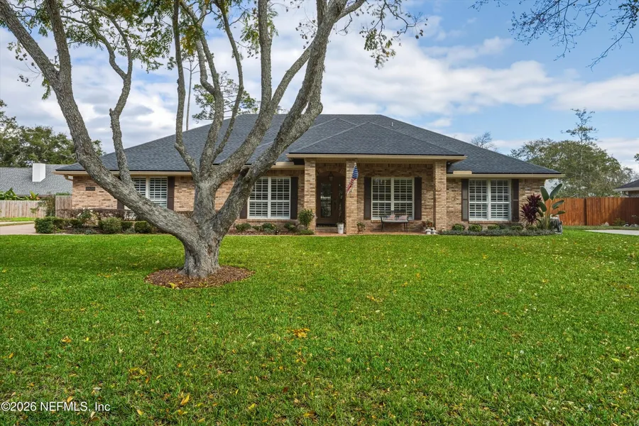 A gorgeous brick pool home nestled in the heart of Mandarin, just minutes from the river. This beautifully remodeled residence features two spacious owner's suites, each with private access to the pool and backyard, offering exceptional flexibility and privacy. Soaring cathedral ceilings create a grand, light-filled atmosphere, complemented by plantation shutters and luxury vinyl plank flooring throughout. The elegant living room is anchored by a striking white brick wood-burning fireplace, providing a sophisticated yet inviting space for both formal gatherings and everyday living. The designer kitchen and baths showcase high-end finishes that allow the home to show like a model. The classic brick exterior is enhanced by a side-entry garage, elegant paver driveway and walkways, and lush landscaping. Step outside to a screened porch overlooking the sparkling heated pool, all set within a ...