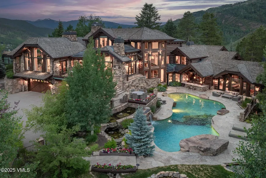 Surrounded by towering aspens at the top of a private, gated drive, 1452 Buffehr Creek is the embodiment of elevated alpine living. Completed in 2001 and masterfully expanded in 2008, the nearly 14,000 sq ft estate rests on 1.15 sun-drenched acres with unobstructed vistas of Vail Village and the Gore Range. 10 bedrooms-including a secluded primary wing with fireside bedroom, view-filled office, and terrace-provide resort-level comfort for family and guests alike. Hand-hewn timber, dry-stack stone, and soaring trusses define the great room, where floor-to-ceiling glass blends seamlessly with the outdoors. A chef's kitchen with an oversized island, butler's pantry, and integrated wine storage anchors the main level, spilling onto south-facing decks ideal for summer entertaining. The lower level is pure indulgence: a nature inspired swimming pool, full spa with sauna and massage studio, state-of-the-art theater, and recreation lounge that opens to flagstone patios and a fire-pit terrace. Additional highlights include smart-home systems, central humidification and A/C, a heated oversized four-car garage with snow-melt motor court, and the option to purchase a prestigious full Arrabelle Club membership. Five minutes from Vail Village yet worlds away in privacy, 1452 Buffehr Creek balances serenity and convenience in one extraordinary mountain sanctuary.