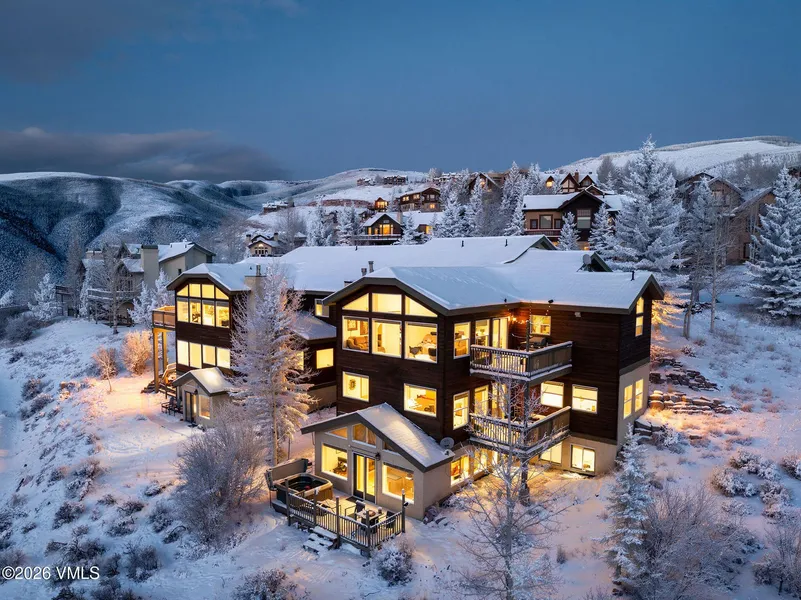 From the moment you enter this spacious home, it's clear why Wildridge is considered one of the premier communities in the Vail Valley. The main living level is the heart of the home, highlighted by a dramatic wall of windows framing unobstructed, panoramic views of Beaver Creek ski slopes and the Sawatch Range, including iconic Mount of the Holy Cross. Vaulted ceilings crown the open-concept kitchen, dining, and living areas, creating an elevated gathering space anchored by a stone fireplace. A southeast-facing, sun-protected deck extends the living space outdoors, ideal for relaxing afternoons and evening entertaining. A gas grill makes al fresco dining effortless while enjoying the spectacular mountain scenery. These breathtaking views can be enjoyed from all three levels of this hillside home. The middle level features an oversized, one-of-a-kind media room with a 135-inch theater screen and ceiling-mounted projection TV, plus a fully equipped wet bar. The generous space allows flexibility for a pool table, golf simulator, or additional entertainment options. This level features two bedrooms, one is a primary suite with private deck. The second bedroom, currently configured as an office, includes a queen-size Murphy bed. The lower level, which could easily be converted to a lockoff, hosts the second primary suite, complete with a gas stone fireplace, ensuite bath with jetted tub, and French doors opening to a ground-level deck. Here, a six-person hot tub offers the perfect apres-ski retreat under dark mountain skies, with views of Beaver Creek's snowcats preparing the slopes. A fourth bedroom with ensuite bath completes this level. An oversized two-car garage with lock-off storage, resurfaced driveway and entry (2025), and air conditioning offer exceptional value (under $500/ft). Wildridge residents enjoy hiking and biking trails, a dog park, and direct ATV access, all just minutes from world-class skiing, dining, and entertainment in Vail and Beaver Creek.