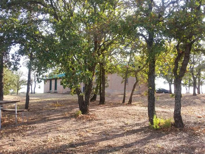 You'll LOVE this house that sits out in the country approx. 11 miles to Eastland, 10 miles to Gorman. BRICK 3 (or 4) bedroom, living room, dining, kitchen. Covered porch. Fireplace. All electric. Newer central heat and air. Newer metal roof. TWO WATER WELLS. Metal barn and well-insulated 20'x'20 and 10'x10' heated and cooled guest rooms or office. POND STOCKED WITH FISH approx. 25 yds from the patio! TWO ACRES across from a coastal field.