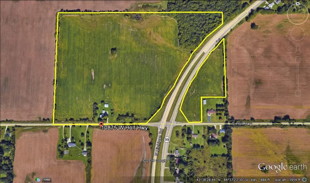 The location is fantastic for this 51.81 Acre farm in Windsor Township. The property includes 3 parcels. One parcel is at the NE Corner of M-99 and Holt Road, it contains 5.63 acres and has 350+/- feet of frontage on Holt Road and 1,300+/- feet of frontage on M-99. The other two parcels containing 46.18 acres are located at the NW Corner of M-99 and Holt Road and feature 1,250+/- feet of frontage on Holt Road and 1,300+/- of frontage on M-99. The property has a 1,470 square foot 2-story farm house along with a detached 22' x 32' 3 car garage and a 28' x 40' pole barn. The property is almost entirely farm land except for about 3 acres of woods. The property is currently being leased out for farming and the long term highest and best use of the property would almost certainly be commercial or residential development.