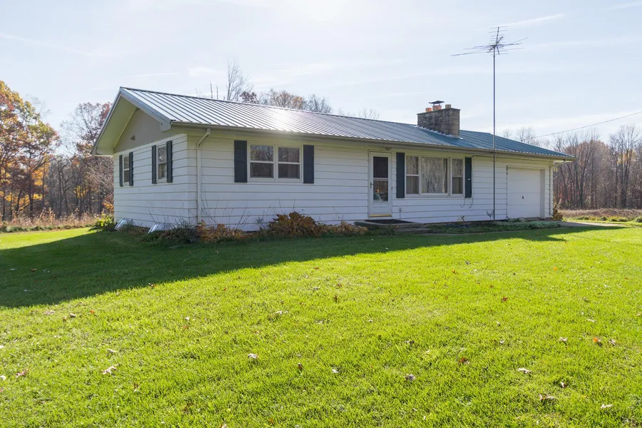 Welcome home to 9915 S. River Rd in Battle Creek. This 2 bedroom, 1 bathroom ranch home is situated on 3.25 acres and features many updates. Updates include; new metal roof, new water softener, updated bathroom, and refinished hardwood floors. The main level features a living room with gleaming hardwood floors, a wood burning fireplace, and is open to the dining room. The dining room features a glass slider leading to the sun room, which is surrounded by windows and overlooks the wooded backyard. The main level also features 2 bedrooms with hardwood floors and a full bathroom. Additional features include; 1st floor laundry, a full basement, an attached garage, and barn.