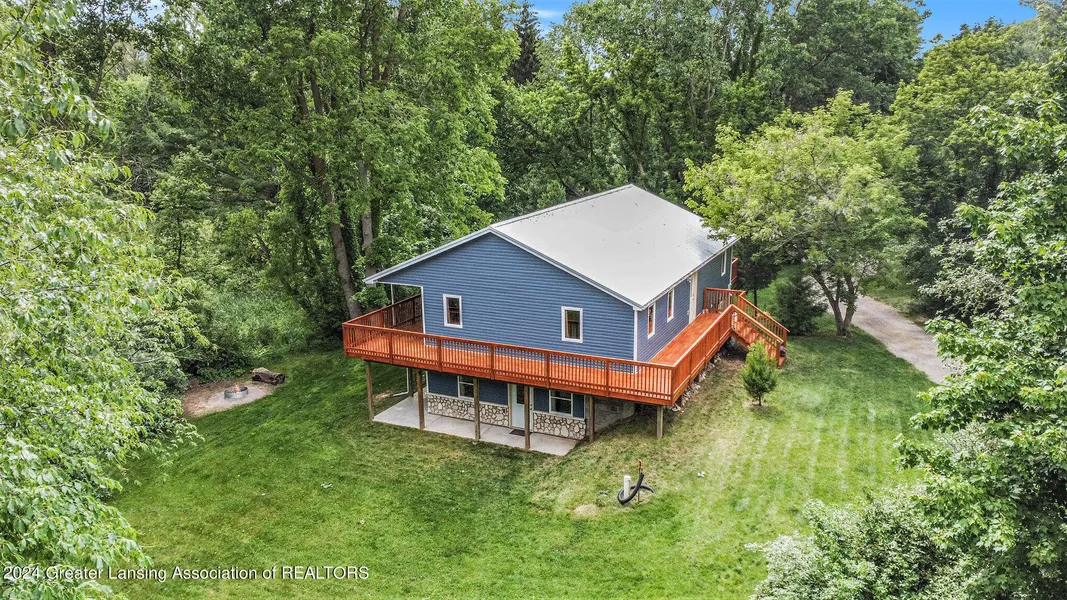 Introducing 7784 Round Lake Road, where every day unfolds amidst nature's splendor and the comforts of modern living intertwine seamlessly with the great outdoors. This secluded property boasts majestic old trees, enchanting woods, and wildflowers, inviting a plethora of wildlife to call it home. Deer, turkey, and rabbits grace the landscape regularly, while the springtime brings the arrival of coveted Morel mushrooms and blankets of wild leeks adorning the property. From the kitchen, witness Michigan's vibrant bird population, with migratory flocks adding to the scenic spectacle during seasonal transitions. Set upon a ridge, this home offers sweeping vistas, including glimpses of Round Lake, while maintaining a sense of seclusion amidst its surroundings a true sanctuary. Step inside to discover a thoughtfully designed layout, where the main level seamlessly integrates the kitchen, living, and dining areas alongside a versatile bedroom or office space, all complemented by a full bath. The kitchen is full of modern elegance with concrete countertops, stainless steel appliances, and ample storage in the pantry. You'll find luxury vinyl plank flooring throughout this home! Upstairs you will find three bedrooms and two full baths, including a primary suite boasting dual walk-in closets and access to a covered wrap-around porch an idyllic spot for morning coffee or evening stargazing. Outside, a spacious 24 x 24 insulated pole barn awaits, complete with full electrical service and water hookup, adding practicality and a wide variety of uses for this space. Further enhancing the property's appeal are features like a durable metal roof and updated vinyl siding accented with Dolomite stone from the Upper Peninsula! With an easy twenty minute commute to Meijer in Grand Ledge or Aldi in Hastings, this home is perfect for all the conveniences of modern day living yet "away" from it all. Reserved - Pole Barn AC Condenser