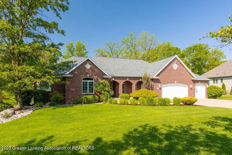 Dimondale - Nestled on the Grand River (no flood insurance required) with beautiful private views in a park-like setting! This sprawling brick front walk-out ranch offers over 4,600+- square foot of living space! Quality galore in this custom-built home with direct water access, features 4 bedrooms with 3.5 baths! Dramatic foyer entry with stunning views of the great room including floor to ceiling Southern facing windows that bring the outside in, anchored by a 3-way fireplace to enjoy from most of the main floor living area! Stunning cherry-stained kitchen offering a center island, granite countertops, stainless steel appliances including an induction range and gleaming hardwood floors. The oversized eating area makes way to the large wrap around and partially covered deck! (outside furniture, umbrella, and cushions remain). Two primary suites on the main floor, one over-sized with vaulted ceilings, his & her vanities with granite countertops, corner whirlpool tub, separate shower, tiled floors, and an over-sized walk-in closet. The 2nd suite includes tray ceilings, a private bath with a yummy shower & granite countertop, a walk-in closet, plus stunning water views. The convenient main floor laundry includes sorting space, a sink, and a window. The wrought iron staircase beckons you to the walk-out lower level. The family room with media & game space plus access to the patio with a lovely wet bar, including a refrigerator, sink, and dishwasher, makes for a great space to entertain off the patio and water. One to two additional bedrooms (one is used as a study), and a 3rd full bath. An oversized exercise room with cork flooring and a mirrored wall. (The exercise equipment stays). Extra deep garage with a service door and loads of storage. The special engineered 36 X 26 room under the 3-car garage includes hydraulic heated floors plus a garage overhead door for easy in and out access, is finished and can be a multi-use area with amazing possibilities. See attached seller items. Extras include central vac, sprinklers, security system, built in storage in the garage, plus pre-wired for surround sound. Note: sq. footage is per appraisal.