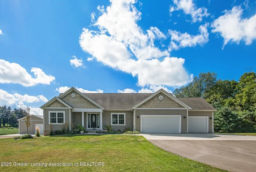 Beautiful 5-bedroom, 3-bath home on 2 private acres with an open floor plan, high ceilings, and hardwood floors. Split-ranch design features a private primary suite, formal dining, and daylight lower level with family room, two additional bedrooms, and a full bath. The backyard is a showstopper with gorgeous stonework, lush plantings, fire pit, and gazebo. Plus, a 3-car garage and 40'x56' pole barn offer plenty of space for all your needs.
