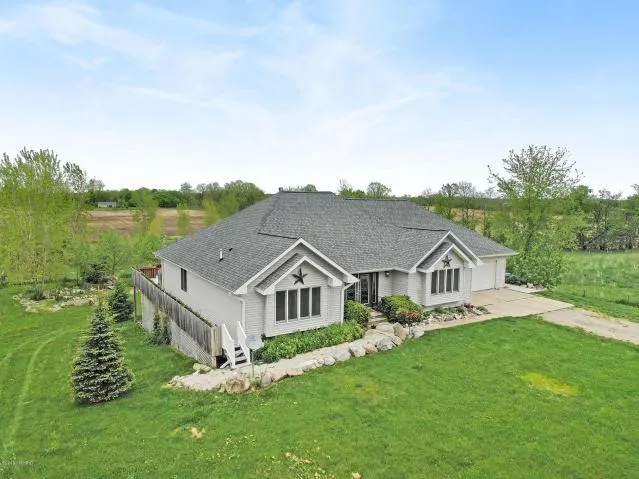 This private 10-acre organic country property is just minutes from I-69, and 20 minutes from Lansing. Inside, the spacious one-story walkout has a newly remodeled kitchen, a main level master suite & laundry, and three other BRs on the opposite side of the house, offering plenty of privacy. The 3-season room and large deck offer great views of the gently rolling countryside. The large walkout level is partially finished, with plenty of space for a workshop, storage, and living space. Outside, the grounds feature a .5 acre pond, a 24'x32' barn, 8 fenced paddocks, and other outbuildings. The property has supported sheep, chicken, and bees, and currently yields apples, peaches, sweet cherries, sour cherries grapes, and a variety of vegetables.
