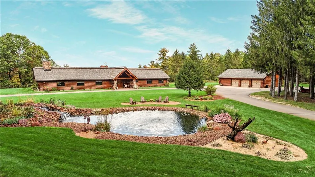This remarkable log home sits on 12.85 private acres on outskirts of Eau Claire - your own retreat! Long paved driveway leads to beautifully landscaped yard w/pond. Grand open concept kitchen/dining/living room, perfect home for entertaining! Commercial heated floors, sub zero refrigerator & freezer, Per Mar security systems, 4season room to enjoy all the views. Bow hunt right out the back door! Two separate wells (one for home, one for sprinklers). 28 X 48 heated garage with coated floor & water plus 55 X 56 heated & insulated pole building. Logs have been sealed every 4 yrs. (just done 2021). Separate 1.86 lot included (see map). Data from 3rd party sources - buyer should verify.