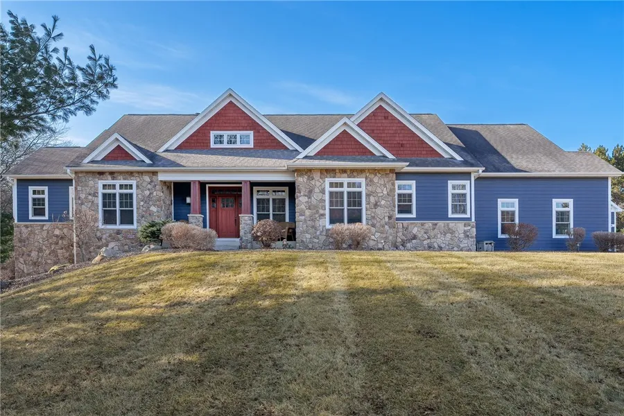 The perfect blend of luxury and comfort fill this conveniently located home on Eau Claire's south side in the Town of Washington. Nestled on 2 acres, this exceptional one story home offers a combination of space, craftsmanship, and timeless design. Built with the renowned quality of Steen Construction, this home welcomes you with vaulted ceilings and exposed beams that create a warm and inviting atmosphere. Expansive living area is anchored by a stunning stone wood-burning fireplace, while rich Brazilian hardwood floors and elegant woodwork reflect the home's thoughtful design and attention to detail. Throughout you'll find quality carpentry in the trim, windows, and built-ins for extra storage. Gourmet kitchen features cherry cabinetry, premium appliances, and a functional layout. In floor heating throughout the basement and detached garage, central vac, sprinkler system, sound system, invisible fence, and stunning landscaping are just a few bonuses of this gorgeous home.