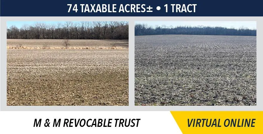 The property contains a total of 74 taxable acres, will be sold in one tract, and represents productive tillable farmland.
