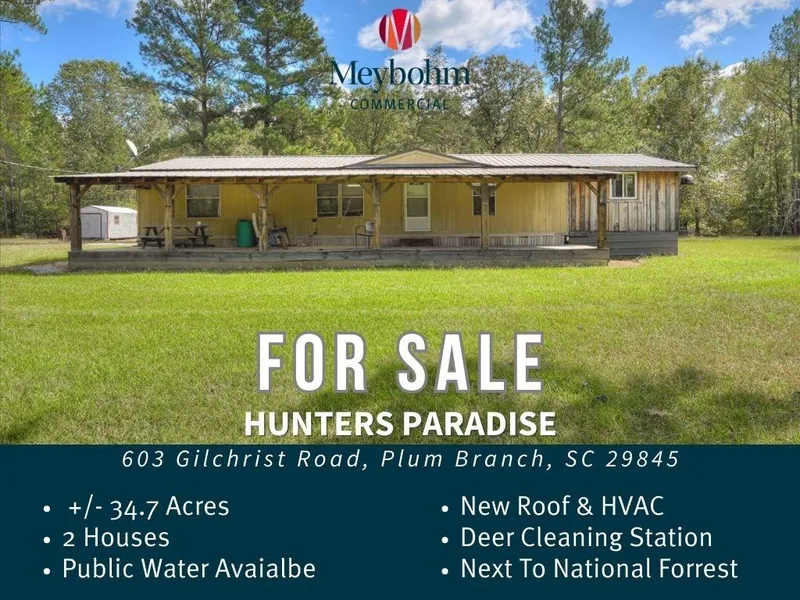 Meybohm Commercial Properties is proud to exclusively present this +/- 34.7 acre hunting tract located in Plum Branch, SC in Edgefield County and sits just behind Sumter National Forrest. The property consists of one mobile home (approximately 1,300 sqft), one cabin (400 sqft), deer cleaning station, deer stands, carport, trails, and more. The mobile home has four bedrooms, two bathrooms, appliances that will remain, fireplace, covered porch and deck, new roof and HVAC. The cabin consists of one bedroom, full bathroom, kitchen, living room, appliances, and covered porch. Both homes run on well water but public water is available. Mostly wooded with a few cleared areas for food plots and a creek runs along side the property. Plenty of wildlife, perfect for deer, turkey, boar, and more. Property being sold "As Is!"