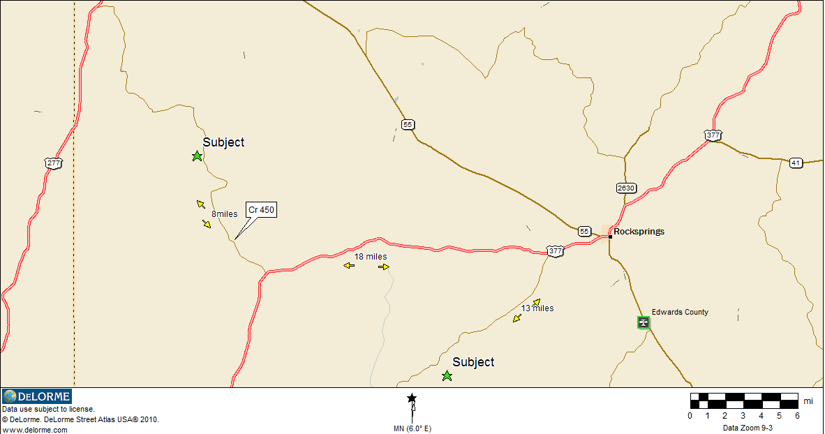 581.3+/- Acres in Edwards County. 19 mls W of Rocksprings off of Hwy377 on CR450. Varied terrain including high elevations and fertile mesquite valleys. Draws with abundant liveoak trees that provide excellent hunting opportunities. Heavy cover in native vegetation. Area known for great whitetail. Whitetail, axis, fallow & sika deer, turkey, wild hogs, dove & quail. Ranch surrounded by large neighbors. Beautiful views. Interior road system. Remote. 3/2 mobile home in like new condition with covered porch. Completely low fenced. Water well. Submergible pump. Water storage tank. Watering troughs. Metal 20 x 35 barn. Storage building. (listing #501) $752,654