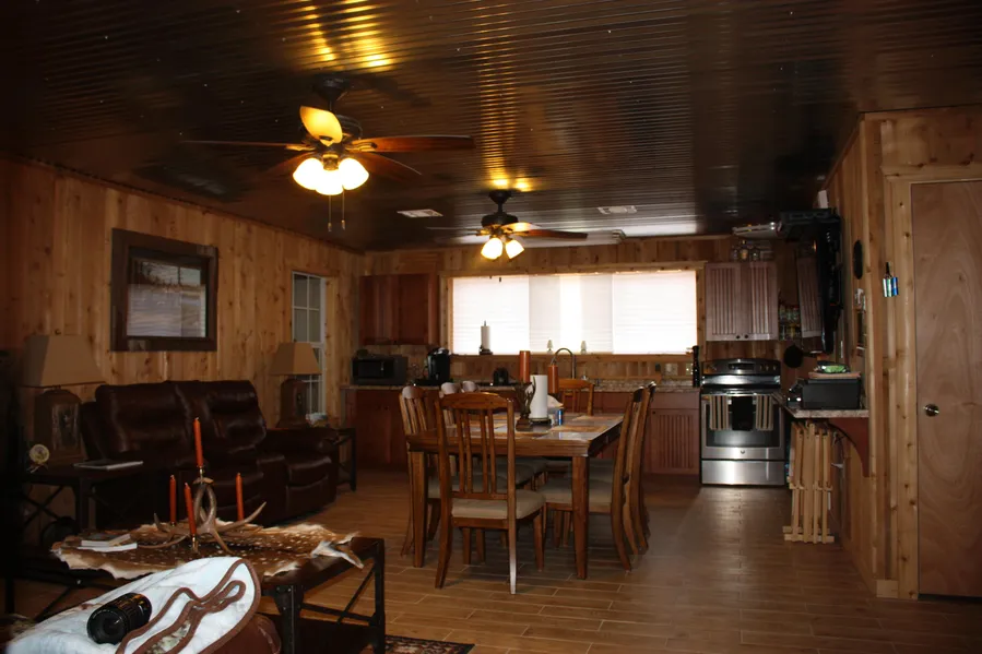 The lodge is a barn-dominium, having half of the building set up as an indoor garage area, and the other half finished out as a two story living area. The bottom floor of the living area consists of a large kitchen/dining/living room area along with a master bedroom and full bath. Above that sits three additional bedrooms and a full bath. All appliances are included, along with flat screen TVs and an internet booster inside the lodge. Located next to the lodge is an outdoor structure to park machinery, ATVs, ranch equipment, etc.