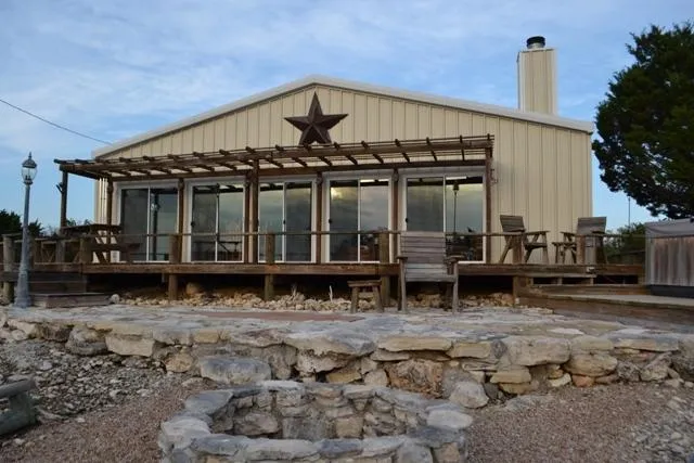Custom Designed Large Roomed Home: 2/2. 400sf drive through garage with opener. +/-1000sf great room with large stone fireplace. 2000sf of air-conditioned living space. +/-2000sf of outdoor living space on a wrap-around 4 level deck and stone patio with hot tub deck and fire pit. Home sits on a ridge allowing for 20 mile views. Located East of Rocksprings in Edwards County, just two miles off of Hwy41 fronting on CR230. Rolling terrain with good mixture of Cedar, Live Oak, Shin Oak, and Spanish Oak, and abundant vegetation and cover allowing for great habitat for wildlife. Variety of wildlife -- Whitetail Deer, Axis, Fallow, Sika, Turkey, and Dove seen on the property. ADDITIONAL FEATURES: Ceramic tile floors throughout entire 2000sf. Hot water recirculating system (instant hot water). Water softener system. BIBS insulation system and low E-glass. Cathedral beamed ceiling in 40X25 great room, with large stone fireplace. Designer ceiling fans. Upgraded lighting fixtures. Upgraded plumbing fixtures (jetted tub and separate shower). Kitchen:-Custom Hickory cabinets, Quartz counter tops, Stainless steel appliances (including wine cooler and under counter ice-maker). All appliances, including washer/dryer will convey. Numerous build-ins (bookcases and custom hickory cabinets). 200 amp electrical service and 12 gauge wiring throughout (all electric house). Outdoor shower. Deck furniture will convey. Separate well house (400 well; great water). Steel barn 32X25 with workshop. RV pad and hook-ups (excellent location for bunkhouse). Double dog pen. 1 feeder and 1 water trough. Polaris ATV will convey (low hour). CharBroil gas/charcoal grill/smoker will convey