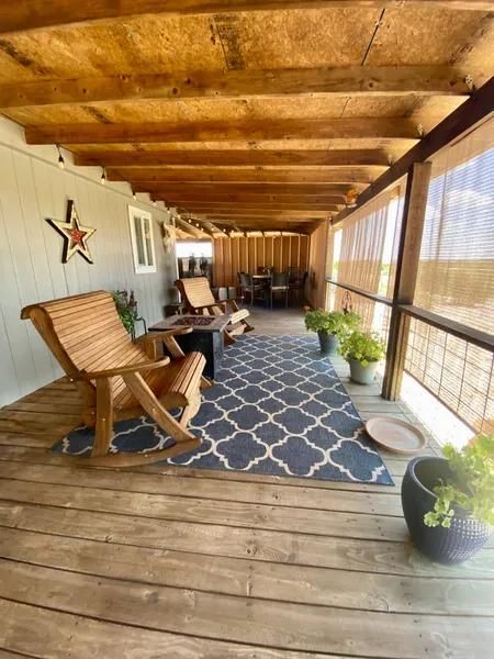 This newly constructed exceptionally nice 2 bedroom/2 bathroom 1400 sq ft home sits on 150 acres in Western Edwards County. Enjoy the beautiful Hill Country scenery from the 1300 sq foot covered deck. An outdoor cooking area is ideal for entertaining family and friends! Wood style vinyl plank flooring throughout the home is durable, and water and scratch resistant. Kitchen amenities include custom cabinets, a bar top seating for 4, and a walk in pantry. The water system consists of a Reem Performance Platinum tankless water system, a water filtration system, (2) 1550 gallon water storage tanks and 120 gallon pressure tank and pump. Water is supplied to the storage tanks directly from the shared well located just outside property boundary. All major appliances convey. A 20x24 barn houses the water and pressure tanks and an additional 20x24 barn with covered carport houses automobiles and ...