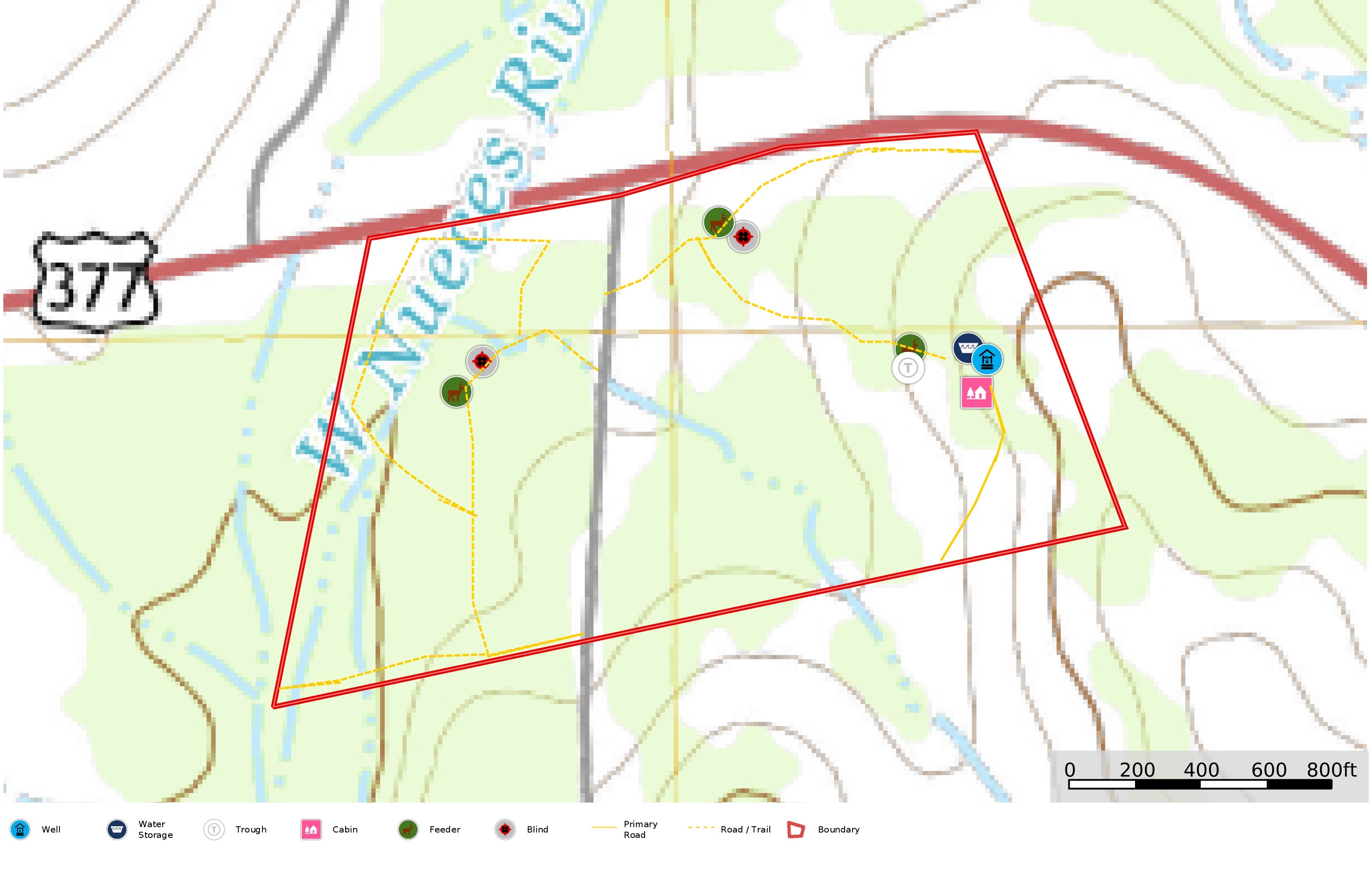 The famous dry creek bed known as Erwin Draw runs through the property feeding into the west Nueces River serving as a constant pathway for large herds of axis and other wildlife for years
