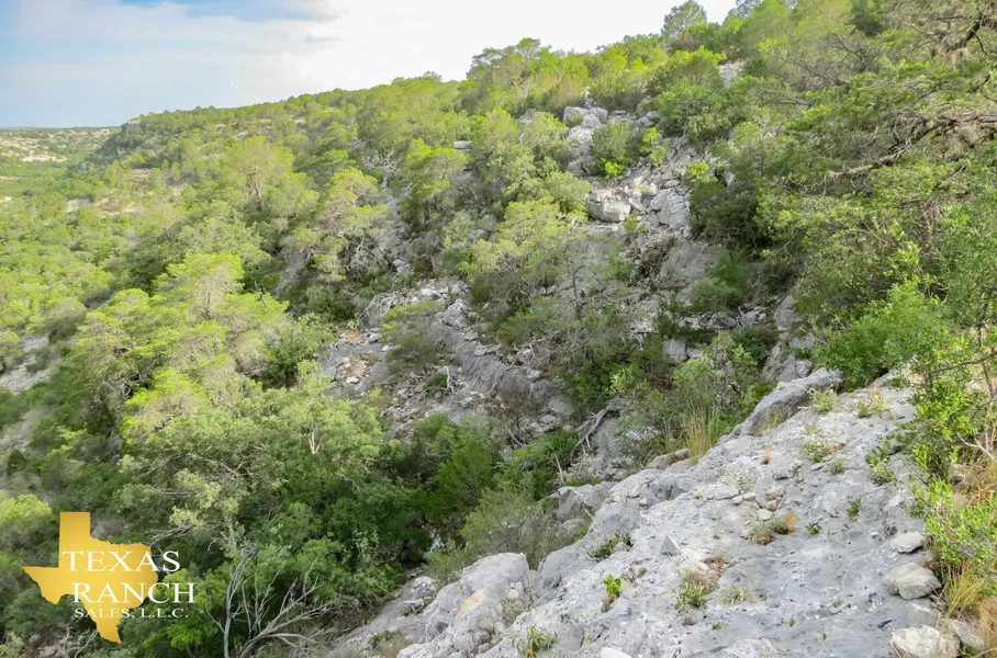 The ranch enjoys private road frontage on two sides and is partially low fenced. Varied terrain with pinon pine, live oak, shin oak, mesquite, and cedar characterize the land. There is also plentiful mountain laurel and persimmon throughout the property. The ranch is roughly equal parts pasture and brush, with dirt and rock trails throughout. Notably, a high ridge on the ranch gives way to flats and a wet weather creek. This terrain attracts a variety of wildlife including aoudad, axis, whitetail, hogs, dove, quail, and turkey.