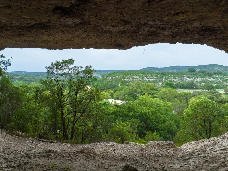 The Caverns Ranch is a stunning estate that proudly serves as the headwaters of the Nueces River, boasting a breathtaking, 360-degree vista of the rolling hills that surround the entire area. To reach the front gate, there is a 1.1 miles drive along a dirt county road, which winds through another ranch before arriving at the entrance of The Caverns. The headquarters of the property is situated in a picturesque valley flanked by a creek and striking limestone cliffs.