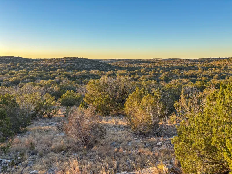 The property features diverse terrain with elevations reaching up to 2,200 feet, providing panoramic views of the surrounding rolling hills. Approximately half of the acreage consists of dense brush, while the remaining portion is open pastureland. The land is densely covered with cedar and hackberry trees, and a wet-weather creek meanders across the ranch for 1,100 feet.