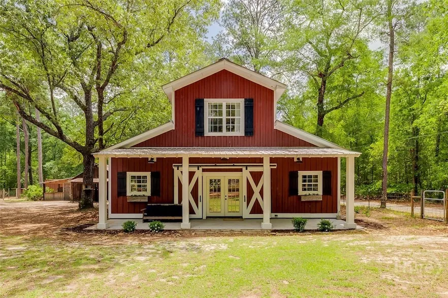 NO HOA or COVENANTS! Enjoy true privacy on this 5-acre wooded lot. This charming modern farmhouse welcomes you with a brick-fenced entry and a front porch perfect for rocking chairs. Inside, the spacious living area features rare antique hardwood flooring and distressed double barn doors opening to a generous master suite with a full bath. A side entry opens to a drop zone and a laundry room outfitted with custom cabinetry. A spiral staircase serves as a stunning centerpiece, guiding you upstairs with two bedrooms, a full bath, and a kitchen full of farmhouse charm. boasting antique heart pine cabinets. Built for comfort and energy efficiency, the home includes spray foam insulation in all exterior walls and rafters, plus central heating/air. Outside, a barn/shed, chicken pen, and goat pen, all ideal for hobby farming or peaceful country living. Don t miss this rare opportunity to own a ...