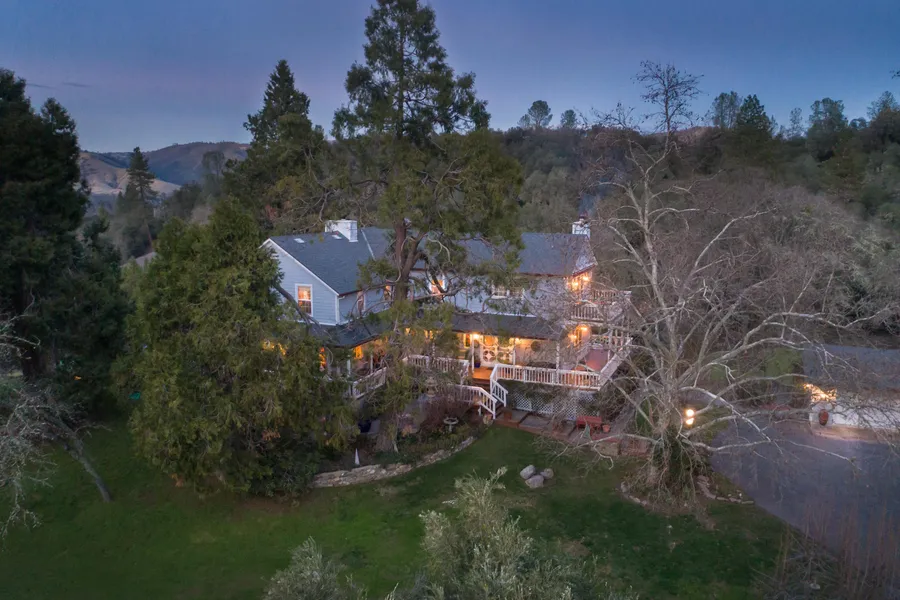 FIVE POND RANCH: This spectacular Farmhouse with a full wrap-around porch is surrounded by century old majestic oaks on almost 40 acres. Located in the historic Lotus/Coloma area it was originally built in 1893 but due to wildfire it was rebuilt around 1940. Then around 1990 the home has updated w/a master suite, kitchen w/stainless steel appliances, Jenn-Air stove/cook top, a wine frig, subzero refrigerator, apron sink & beautiful counter tops designed with a quality mix of specialty glass from Italy, tongue & groove oak hardwood flooring, carpet and dual Heating/Air units and some electrical was updated. The 38 plus acres is fenced and cross fenced, multiple irrigation controls panels for the pastures as well as being a member of the American River Ditch association that feeds water into the pond[s]. Barlett pear, Asian pear, Fuyu persimmon, Plum, Pluot and assorted apples trees in the fenced garden area. 2 barns, chicken coop, workshop and the 3 car garage has office w/bathroom.