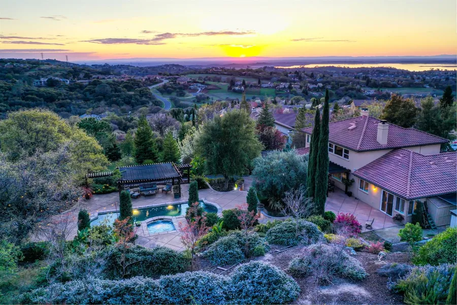 Opportunity knocks! Take the virtual walk through tour of this impressive home offering best in this gracious living w/hand scraped wood flrs, custom shutters & crown molding combined w/tasteful details on a resort-style 1.84 acres offering owned solar, local & lake views. Style & warmth will delight the chef's senses w/picture window overlooking the backyard, dble ovens, abundant cabinet space, granite counters & spacious center island that opens to family rm & flows into the dining/living rms. Downstairs master boasts 2 closets, backyard access & en suite ba. w/soaking tub, dual sinks & shower. Not to be overlooked are the upstairs bedrooms w/walk-in closets & large bonus rm w/views of the spectacular yard. Every day is a vacation in the expertly designed backyard built for relaxing, fun & entertaining. Stunning 41' pool w/raised spa, multiple custom patios, outdoor kit. w/BBQ, pizza oven & granite bar seating. 3 pergolas, grassy area, vineyard, garden/fruit trees & RV/boat storage.
