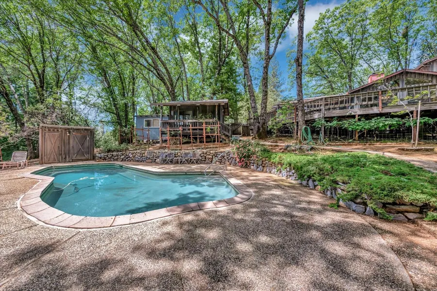 Rustic charmer in the Country! This custom built home is truly one of a kind. The double door entry welcomes you to the foyer which opens up to the back of the massive stone hearth which is the center piece of the home. Open beam vaulted ceilings makes this family room inviting and spacious. Double sliding glass doors and multiple windows open the home up to the great outdoors and let in an abundance of natural light. Home has 3 bedrooms and two baths downstairs. Upstairs has a bonus room that could be used as 4th bedroom, with its own private balcony overlooking the backyard. Primary is spacious and has a great sized walk-in closet. Jetted tub in Master bath with a separate shower. Kitchen has gorgeous antique oven along with a built in double oven, island with cooktop and a huge pantry! Large dining area has sliding door out to the enclosed deck. Enormous deck off the back of the house overlooks the pool and patio area which is great for entertaining. Don't forget to check out the poolhouse which has its own bathroom. Attached to the home is a 3 car garage which houses the generac system. The detached barn has a 2 car garage along the side and a studio apartment up above which is great for a rental income or adult children. Back yard is fully fenced and has mature landscaping.