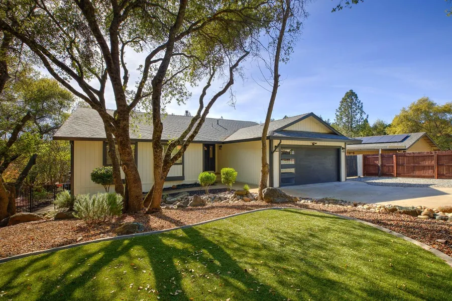 Nestled in the serene landscape of Cameron Park, this remodeled home presents a harmonious blend of modernity and natural beauty. Featuring three bedrooms and two bathrooms, it boasts new floors, paint, cabinets, counters, and updated roofing, heating, and air systems, ensuring both comfort and style. The heart of the home lies in its meticulously redesigned kitchen, adorned with custom cabinets and sleek countertops. Adjacent to the kitchen, the living area opens onto a spacious deck, offering stunning views of the lush backyard enveloped by towering trees. The three bedrooms provide peaceful retreats, with ample natural light streaming through large windows. The absence of carpet enhances the aesthetic appeal while maintaining a clean and allergen-free environment. A unique feature of this home is the studio apartment located in the basement, although its permit status remains unknown. It offers potential for additional living space or rental income, adding versatility to the property. Outside, the expansive deck provides an ideal setting for outdoor entertainment or quiet relaxation amidst the tranquil surroundings. With its blend of modern upgrades and natural charm, this remodeled home offers a serene retreat for those seeking a balance of comfort and tranquility,