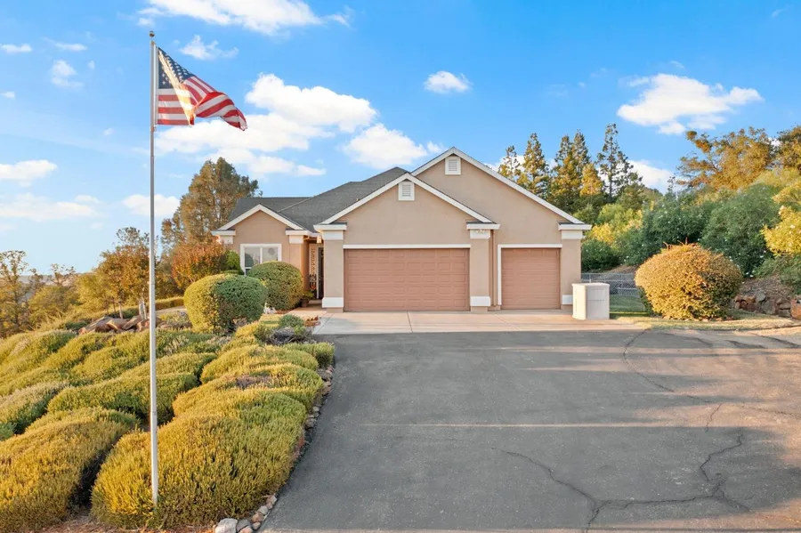 Come discover breathtaking views minutes from city life! Built in 2003 with 3 bedrooms plus an office on 10 acres, this home offers privacy and stunning views of Folsom Lake, Downtown Sacramento, and Mount Diablo. Just 15 minutes from El Dorado Hills shopping and on a county maintained road and is an ideal location for building an additional home or out building. Upon entering you will love the spacious 10-foot ceilings and captivating views both night and day from the living room and dining area. The home offers dual pane windows, remote control sunshades, and a cozy gas fireplace. The kitchen boasts Alder wood cabinets, quartz countertops, a large island, and ample storage. Spacious bedrooms have ceiling fans, and the luxurious primary suite provides scenic views and a walk-in closet, soaking tub, dual vanities and an oversized shower. Dine outside on your covered patio with remote sha...