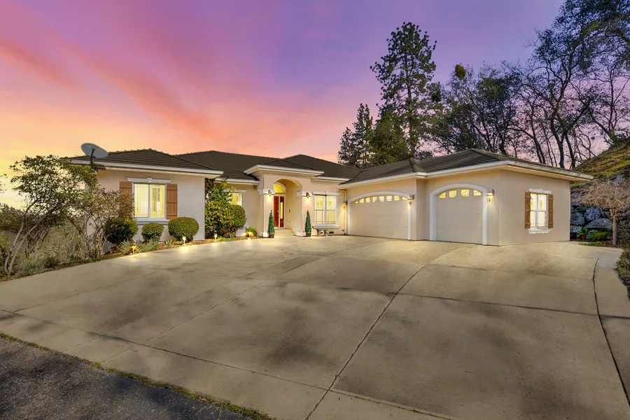 Hilltop Luxury with Breathtaking Views! Nestled high above Shingle Springs and designed by renowned architect Steven Rhoads. This custom 3,457 sqft estate is a true masterpiece, offering unmatched privacy, stunning vistas, and top-tier amenities! Designed for effortless living, this 4-bedroom, 3-bath home boasts a spacious, mostly single-story layout with incredible attention to detail. Step inside to gleaming wood floors, soaring ceilings, and an abundance of natural light. The formal living room flows seamlessly to a massive 750 sqft deck, the perfect spot to soak in the breathtaking scenery of your private 5-acre retreat. The inviting family room with vaulted ceilings offers a cozy gathering space, while the elegant dining room is ideal for hosting. The primary suite is a true sanctuary, featuring a private sitting area, direct deck access, and stunning views. Movie nights will never be the same in your dedicated home theater with an 8-ft projector screen! A separate family or game room with its own bedroom, bath, and patio provides the ultimate guest retreat or entertainment space. Located in a prime neighborhood with easy Highway 50 access, this extraordinary home offers the perfect blend of luxury, serenity, and convenience. Don't miss it!
