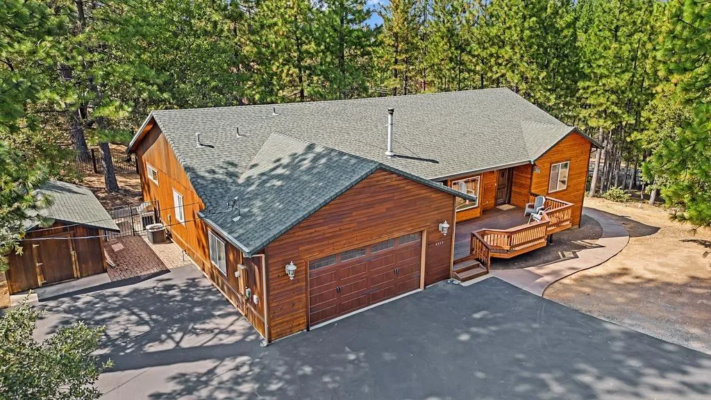 Pull through the gates to this beautiful 5 acre parcel and see what all it has to offer! The well maintained lot is fully fenced and beautifully kept. This property has a 2 car attached garage as well as additional 2 car AND a beautiful 5 car detached garage at separate gated entrance. Both detached garages also have ample attic storage space built in cabinets. Next to 4 car garage is full bath with shower stall plus full RV hookups perfect for your guests weekend visit or extended stay! Behind the detached garages you'll find the beautifully landscaped lawn area that makes for a perfect additional entertaining or relaxing space. 1 acre extends across Meadowlark and is splittable according to seller (ADU area). This custom built home has a spacious open floor plan and tasteful design throughout. The kitchen boasts granite counter tops and loads of counter and cabinet space. Relax in the private master suite after a long day and take advantage of the soothing sunken tub. The beautiful living area shows off soaring vaulted ceilings and cozy wood stove. Accessible from outside is the finished basement area perfect for office, workout room, additional guest space,etc. Just minutes to Sly Park Lake for boating etc. Ski, hike, bike and enjoy nature in the beautiful County of El Dorado