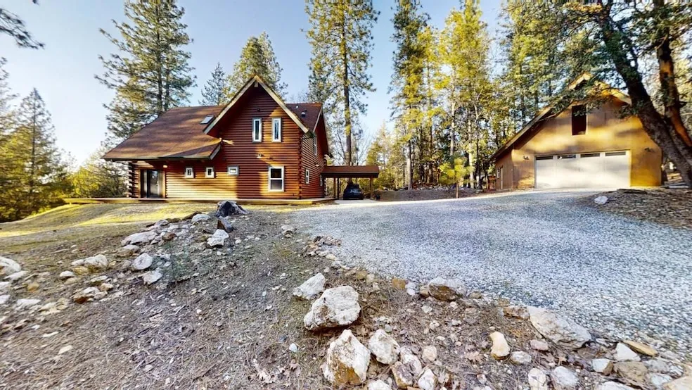 Mosquito Bridge is OPEN AGAIN***Charming log cabin nestled in the woods on a gently sloped, highly usable property, perfect for enjoying nature and outdoor activities. This masterfully designed 3-bedroom, 2-bath home was thoughtfully built by its original and only owner. You'll enjoy the convenience of city water no well to maintain and the septic system will be pumped for the buyer's peace of mind. The property boasts breathtaking, colorful sunsets and a serene walking trail encircling the grounds. Modern amenities include two electric vehicle chargers; one at the attached carport and another in the detached garage, which is plumbed and ready for a potential studio above the newly constructed space. Solar power with battery storage ensures impressively low utility costs. The loft workspace, framed by stunning chalet-style windows, offers inspiring views. Own your dream cabin in the woods!