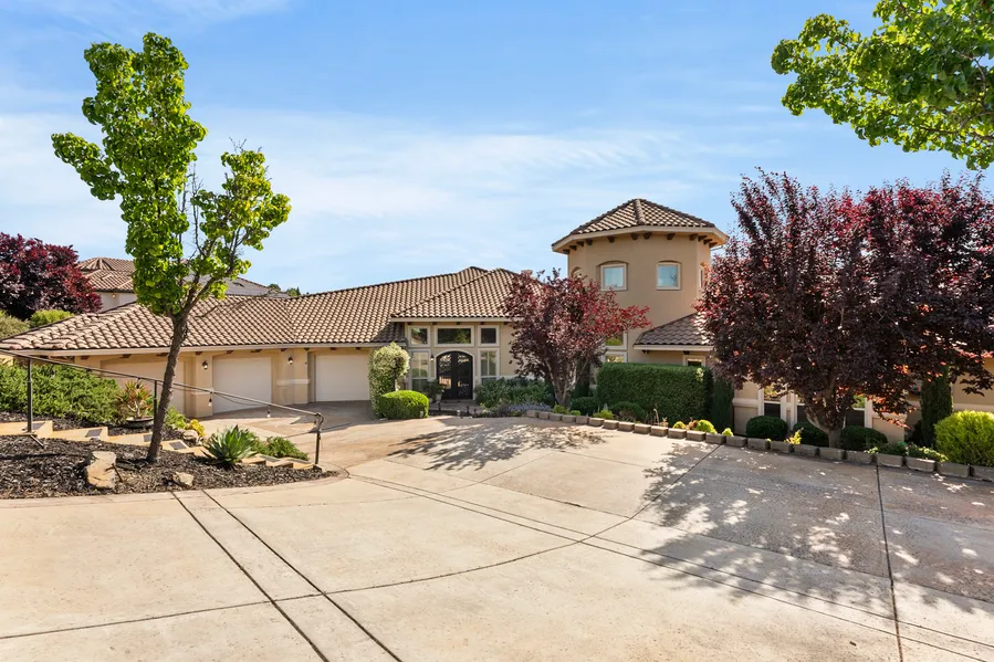 Welcome to this stunning custom home featuring a unique, functional floor plan and designer finishes throughout. The dramatic rotunda-style foyer with soaring ceilings, exposed beams, and inlaid wood flooring sets the tone for this exceptional residence. A bright great room with abundant windows opens to a spacious dining area with trey ceiling - perfect for everyday living or entertaining. The gourmet kitchen boasts granite countertops, gas cooktop, built-in fridge, double ovens, pantry, and a bar that flows into the inviting family room with beam ceiling and fireplace. The separate living room with trey ceiling and second entrance is ideal for guests or multigenerational living. Retreat to the luxurious master suite with fireplace, spa-like bath, walk-in shower, soaking tub, dual vanities, and custom closet. Enjoy a large backyard with covered patio, deck, spa, and beautiful views. Extras include two new furnaces, an oversized garage with EV charger, and membership in the desirable El Dorado Hills Promontory.