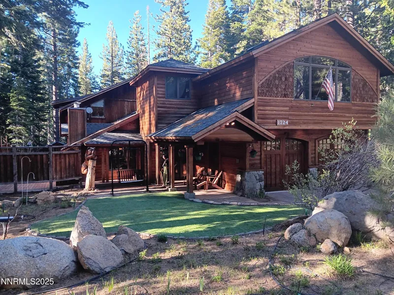 You'll immediately feel warmly welcomed when you come up the drive and see the stained glass door and barrel-vault wooden entry, beautifully designed by Tahoe's own award winning Architect Brian Shinault AIA. From there you can go up the oak and cherry nosed stairway to the Family Room, or forward, into the heart of the home. The family room has a cozy oak-trimmed gas fireplace with a raised hearth and a forever view of the majestic and sometimes snow-covered trees across the way on Government land. Back down to the ground floor, to 2 bedrooms, a full bath, laundry, computer station and the stairway to the basement. The heart of the home is the huge dining area, with a wood stove, the kitchen with Corian counters, custom oak and cherry trimmed cabinetry, a Wolff Stove, Bose dishwasher, both butler's and food pantries and more. The Living room has a huge rock fireplace w/oak hearth a TV a...