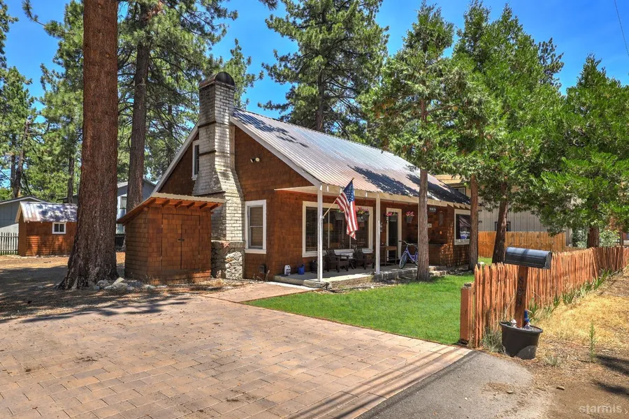 This Vintage Tahoe classy mountain home only 1 block to Regan Beach with filtered lake views both to the left and the right sits on a 10,000 sq ft lot. Built in 1945, you walk in and immediately get that Old Tahoe feel that is in such demand. The 1626 sq ft floorplan offers open living room featuring knotty pine walls, newer gas insert in original fireplace and natural wood floors under the carpet. Kitchen offers plenty of room for all types of gatherings with original knotty pine cabinets, tile counters and dining area with glass slider leading to newer back deck. The space is light and bright with many windows. Downstairs bedroom also has glass french doors leading to fenced rear yard. Both bathrooms have been upgraded. Other recent upgrades include new paver driveway, new forced air unit, natural gas water heater, gas fireplace insert and electrical upgrades. 5 bedrooms to hold the wh...