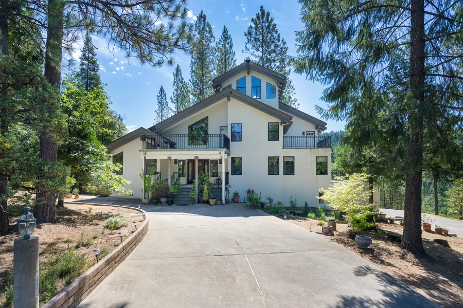 River front property with enchanting swimming holes on 66 acres. This sprawling estate offers privacy in the pines. Main living room, master suite and an office/bonus bedroom on first floor, three bedrooms on second and a birds nest on the third floor with wet-bar and great views. Marble counters and floors throughout. Kitchen is nicely appointed with island and formal dining area. Multiple decks recently sealed. Massive garage space for 10+ cars, room for workshop and storage. Paved access, separate garage, hiking trails, river and large acreage.