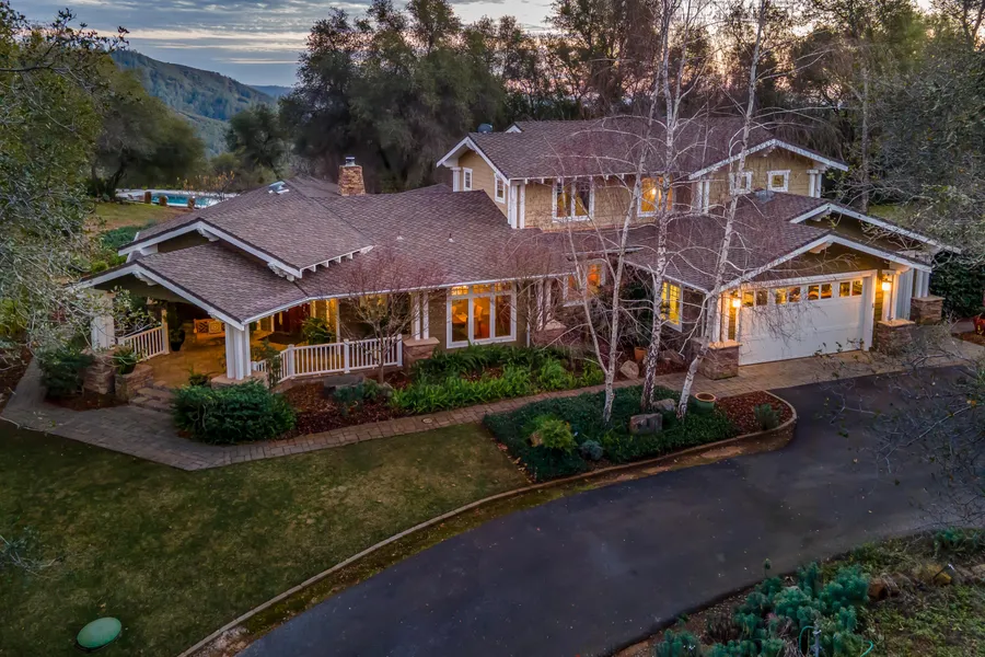 Secluded hilltop estate on 40 acres in Shingle Springs with newly finished detached 1253 sf ADU, owned solar & brand new heated, saltwater pool with landscaping & far-reaching views. Custom-built Craftsman style home boasts 3315 sf of living space with 5 beds and 3.5 bath. Covered front porch leads to formal entry & living room with large windows, wood burning fireplace & elegant wet bar. Kitchen features new Hickory butcher block island, granite counters with subway tile backsplash, cherry cabinets & SS appliances. Primary suite on main level with large walk-in closet, outside access & attached bath with jetted tub, shower & dual sinks. Additional bed & half bath on main level. Head upstairs to 3 more beds, 2 baths and cozy living area with balcony. Well constructed & extremely energy efficient home with ground-mounted solar. Newly finished detached ADU complete with kitchen, bed, & ful...