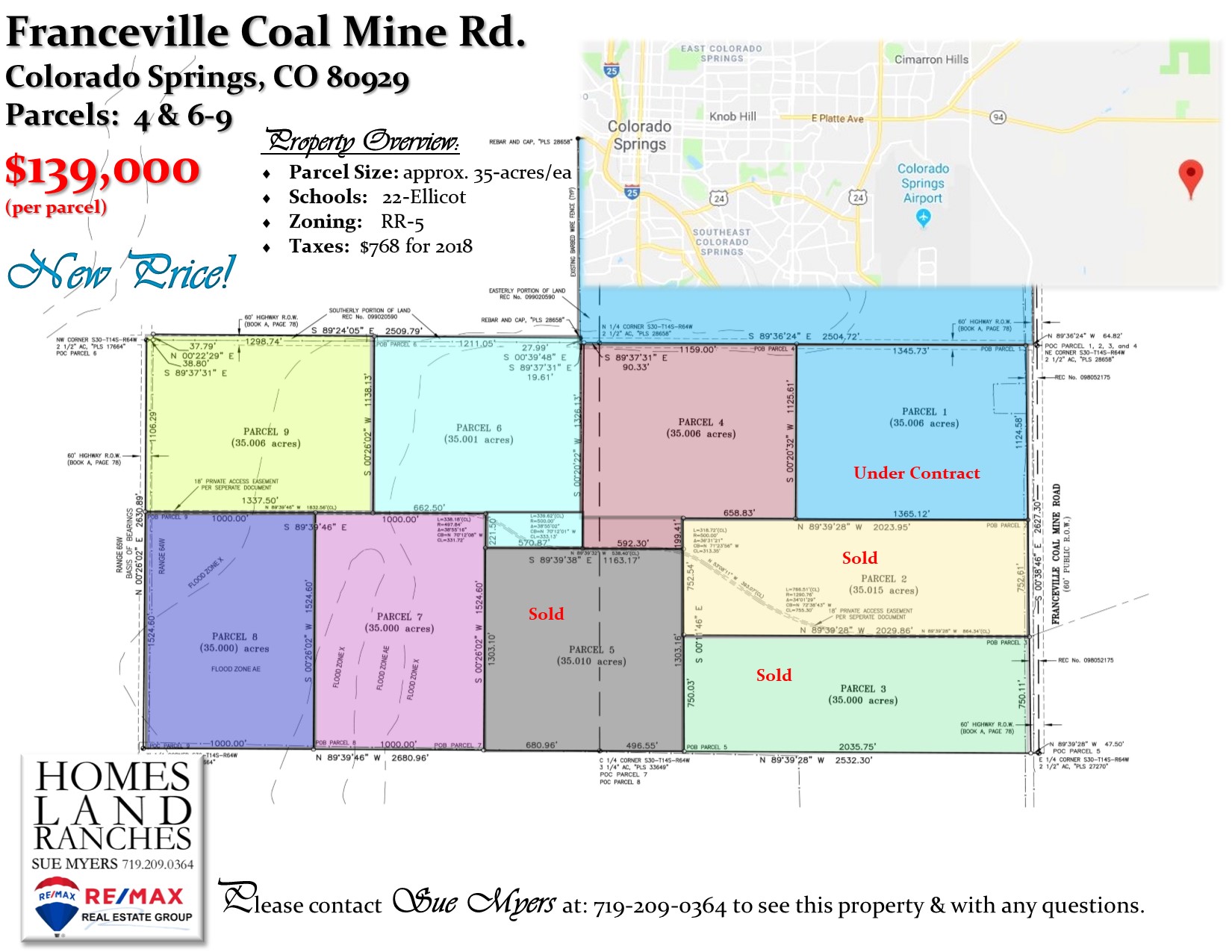 It's all about country living but still being close to the conveniences of the city. Beautiful property just minutes from Colorado Springs. Level meadow with expansive views of Pikes Peak and the Front Range. This is one of five, 35-acre parcels being offered. Water rights include two (2) annual acre feet of not-nontributary groundwater in the Laramie-Fox Hills aquifer underlying the Overlying Land as adjudicated in Case No. 87CW08, Water Division No. 2.