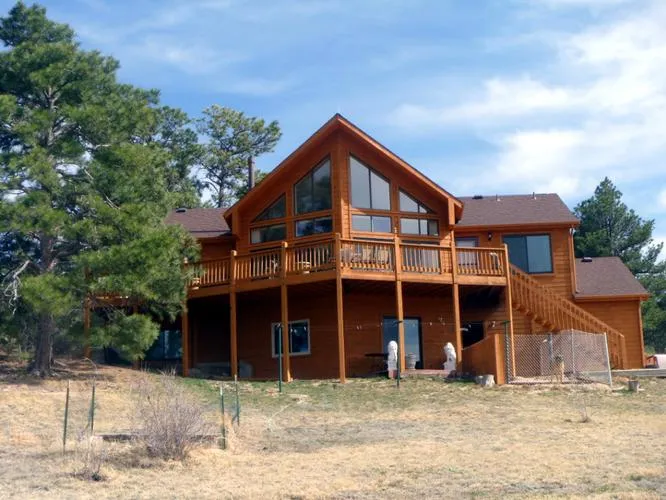 Enjoy country living in this peaceful rural setting with great home on 5.3 acres with Bijou Basin views. The cedar sided mountain style home with prowl front features 4 bedrooms, 3 bathrooms and a 3 car attached garage. You'll love the dramatic great room with gas log fireplace, vaulted ceilings and a wall of windows adding to the bright atmosphere. Kitchen and dining area have hardwood floors and lead to a spacious deck surrounded by trees ready for summer barbeques. The kitchen includes a large working island, tile countertops and abundant cabinetry. The cozy master suite boasts gas log fireplace, large walk-in closet and luxurious 5 piece bath with jetted tub and has access to the large front deck. Also located on the main level are a secondary bedroom and a bright office with French doors. The lower level includes 2 additional bedrooms and a huge family room with pellet stove a...