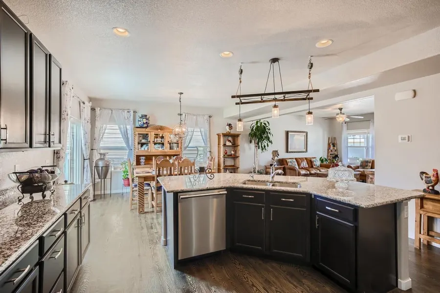The main floor living areas feature lovely HARDWOOD FLOORING. Great open floor plan inclusive of living room, dining area and kitchen. GOURMET KITCHEN featuring GRANITE COUNTERS, UNDERMOUNT SINK, REVERSE OSMOSIS SYSTEM , 42" CABINETS, LARGE WALK-IN PANTRY, GLEAMING STAINLESS STEEL appliances, and an Island with Breakfast Bar. The Dining area walks out to the patio. Featured below the main fl...