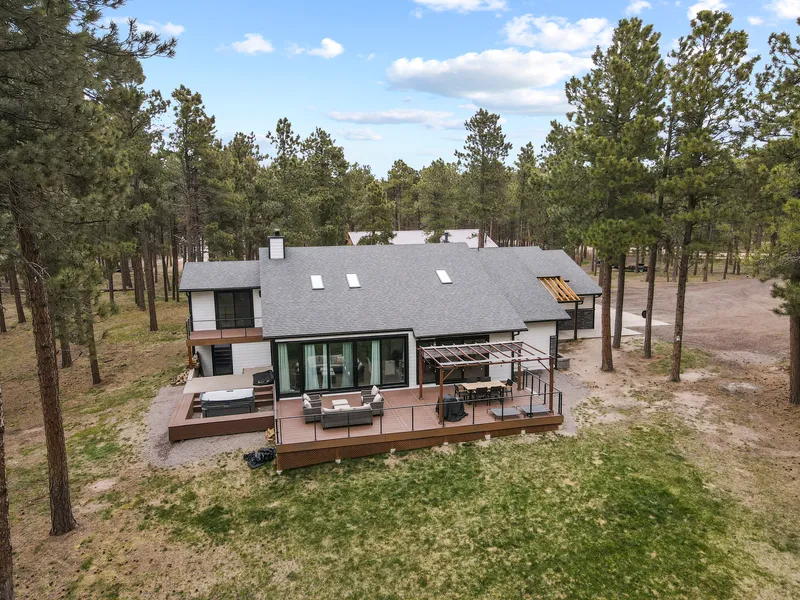 Masterfully remodeled sanctuary in the pines on 6 heavily wooded and mitigated acres in sought after Black Forest providing you the best of both worlds - living on serene, park like acreage while only a short drive to the best amenities. Detached 60x40 metal RV garage with two overhead doors, upgraded separate electric panel providing enough power for RV's and all of your tools, two enclosed workshop areas w/ heat and AC. Parking for 9+ vehicles. The well designed home lives and feels as if you were living in an architectural digest and has been completely remodeled from top to bottom. Upon entering the home you are greeted by soaring vaulted ceilings with beautiful tongue and grove wood ceilings, stone columns, new custom metal railings, wood beam accents, beautiful warm floors, bright light floods the interior from the wall of windows and multiple skylights. Open concept kitchen which is awesome for entertaining guests in the great room. The kitchen has light modern cabinetry, slab quartz counters, a large island with waterfall quartz on both sides, gas commercial range, convenient pot filler and bar w/ built in wine fridge. The great room is expansive in size but feels inviting. Wood fireplace w/ floor to ceiling stone surround, a wall of windows w/ double opening doors which truly bring the beauty of the outside in. The new composite deck overlooks the mature ponderosa pines, has a built-in pergola and hot tub. The primary suite has a fireplace, a walk-out to a private deck and a completely remodeled 5 piece master bath. The master bath has a standalone tub, stone accent wall, double vanity w/ waterfall stone, multiple shower heads and shower massagers. New upgraded roof, doors and windows. Zoned for horses and outbuilding friendly. Sought after north El Paso County location with great access to Highway 83, I-25 and a short commute to Colorado Springs or Denver. Award winning School District 38. Completely fenced acreage with two driveways and custom gates.