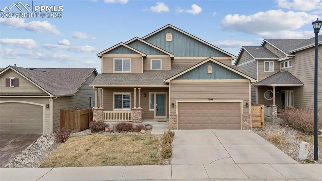 This fabulous home features the one thing that most all home buyers here want, but very few are able to get... Pikes Peak Views!!! Unobstructed mountain views that will never go away as the home backs to dedicated open space. Top that with excellent location just off Mesa Ridge Parkway right as it turns North and into Powers Blvd. So, you are close to Ft. Carson, Peterson, Downtown and Shopping. The home features great curb appeal with a landscaped yard, a covered front porch big enough for a swing. A very gentle sloped driveway, not one of those that you slide down in the winter time. Also, the driveway gets lots of sun in the daytime to melt away any overnight snow! Fenced in yard, with both a deck and a concrete patio make for great outdoor living and wonderful sunsets over Pikes Peak in the evening and early morning light on the Peak while you are enjoying your coffee. There is a grand entry that is tiled, a beautiful dining room that features a cool barn wood accent wall. The great room and kitchen and dining room are all open to each other and also to the deck area that make this home an entertainers dream. Upstairs you will find 4 spacious bedrooms with a main suite that serves as the owners private retreat. The Laundry room also resides on the upper level-so convenient! The basement level is accessed through a locking private door from the great room. It can be set up as it's own private living space! It currently has a bedroom configured along with a full bath with custom tiled shower. There is room in the basement to configure two or three bedrooms if you wanted to maximize co-living space! there is a sliding glass door that goes out to the covered concrete patio and even this level has great Pikes Peak views! And last but not least I have to mention the garage, it is a three car, tandem style garage. The third bay features a rubber floor like you would find in a gym, high ceilings, and a wall of mirrors so that you can have you own home Gym!