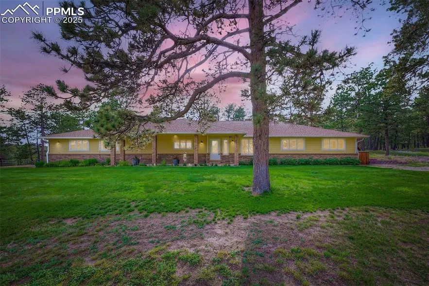 Welcome to the true essence of gracious Black Forest living. This one of a kind property captures the meaning of country elegance with its one level living, manicured 2.5 acre lot, & highest quality of workmanship. Located in fabulous Spirit Lakes with its walking/riding trails (horses welcome!) abundant wildlife, & proximity to golfing & Falcon shopping. Tucked among towering Ponderosa pines with grassy fields, and overlooks the 80+ acre park that is private and for subdivision use only. Hardwood flooring is featured throughout the main level. The step down formal living area is to the right of the entrance with a large picture window, letting nature in. The kitchen features Corian countertops/integrated sinks, 42 custom oak cabinetry, newer appliances, & walk-in pantry. Eat-in counter bar overlooks the large dining area w/ oversized slider open to custom deck & landscaping. A sitt...