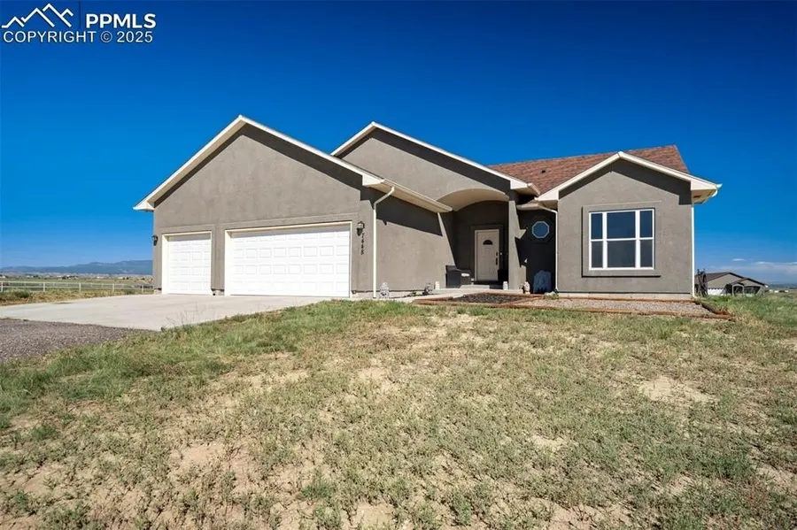 Upon entry, you are greated with a thoughtfully designed open floor plan. The very attractive & durable laminate wood flooring incorporates the Living-Dining-Kitchen area for an easy flow of living space. The grand living room boasts tall vaulted ceilings, a striking stone tiled gas fireplace & mountain views through the large wall of windows. The Dining Nook includes bay windows & a slider door walkout to the covered rear patio area leading to the fenced back yard. The gorgeous kitchen has tons of cabinets, outlets, granite counters & a large breakfast bar island & a pantry closet. No shortage of storage room here! On one side of the home, the Primary Suite is truly a space for relaxation... large, private, & with its own access to the rear patio. The ensuite bathroom is complete with tiled flooring, dual vanities, a beautifully tiled spa like shower & an expansive walk in closet. Additionally, 2 good sized guest bedrooms & a full guest bathroom are located on the opposite side of the home. Conveniently located, the spacious mud/laundry room provides access into the oversized 3 car garage, which includes a propane hookup if one desires to add a utility heater for shop like comfort. With No HOA, this well maintained home provides for spacious, rural country living.... far enought out for privacy, but quick, easy access to I25. Shopping is just minutes away. Interstingly, the minimal light pollution makes for amazing star gazing nights! Lets make this your next dream home!